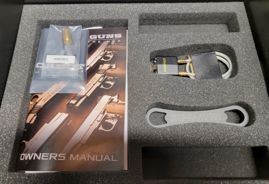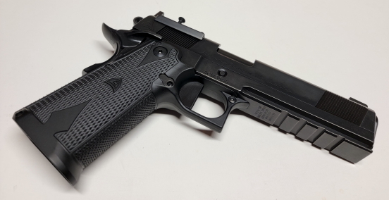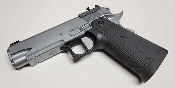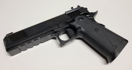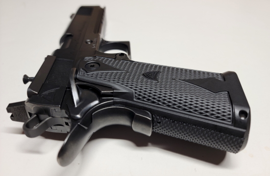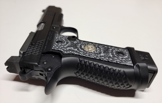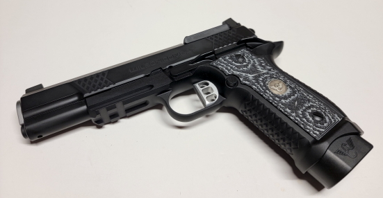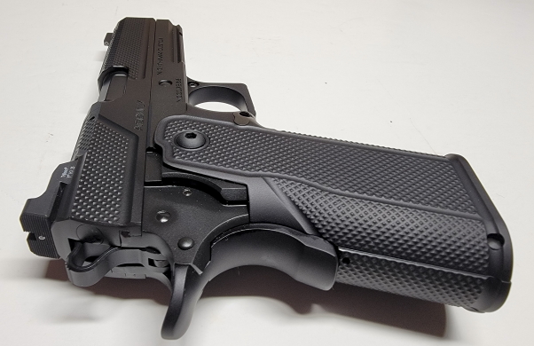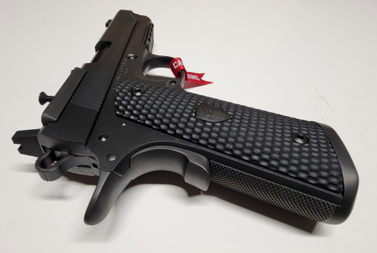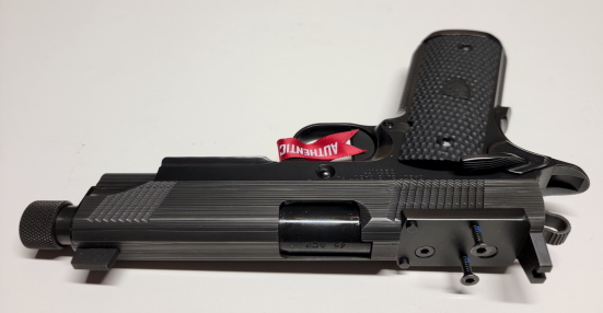 Black PVD finish on small parts: Barrel, Barrel link, Barrel link pin, Slide stop, Magazine release, Magazine release lock, Grip screws, Ambidextrous thumb safety, Thumb safety screw