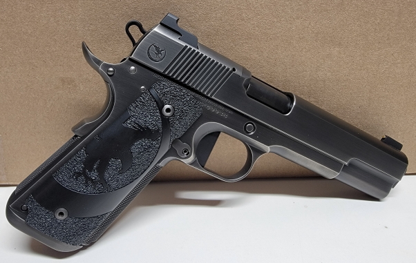 G10 black and gray spiral cut grips, with mag release cut-out, and Nighthawk Logo